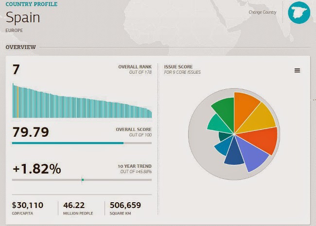 Como decíamos, de 178 países analizados, España se encuentra en el séptimo puesto y está mejorando. La puntuación de España para los distintos elementos también arroja datos interesantes: