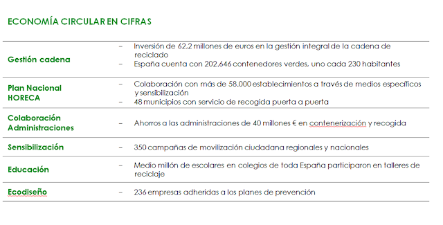 El reciclaje a través de contenedor sumado a los residuos reciclados a través de otras fuentes[nota 1] permite estimar una tasa por encima del 70% en 2015. Esto supone un incremento considerable respecto a los últimos datos oficiales (2013) del Ministerio de Agricultura Alimentación y Medioambiente (MAGRAMA), que sitúan la tasa en un 67,4% [ nota 2] España se sitúa en la media de reciclado de los países europeos y por encima de las exigencias que marca la Unión Europea (60%).